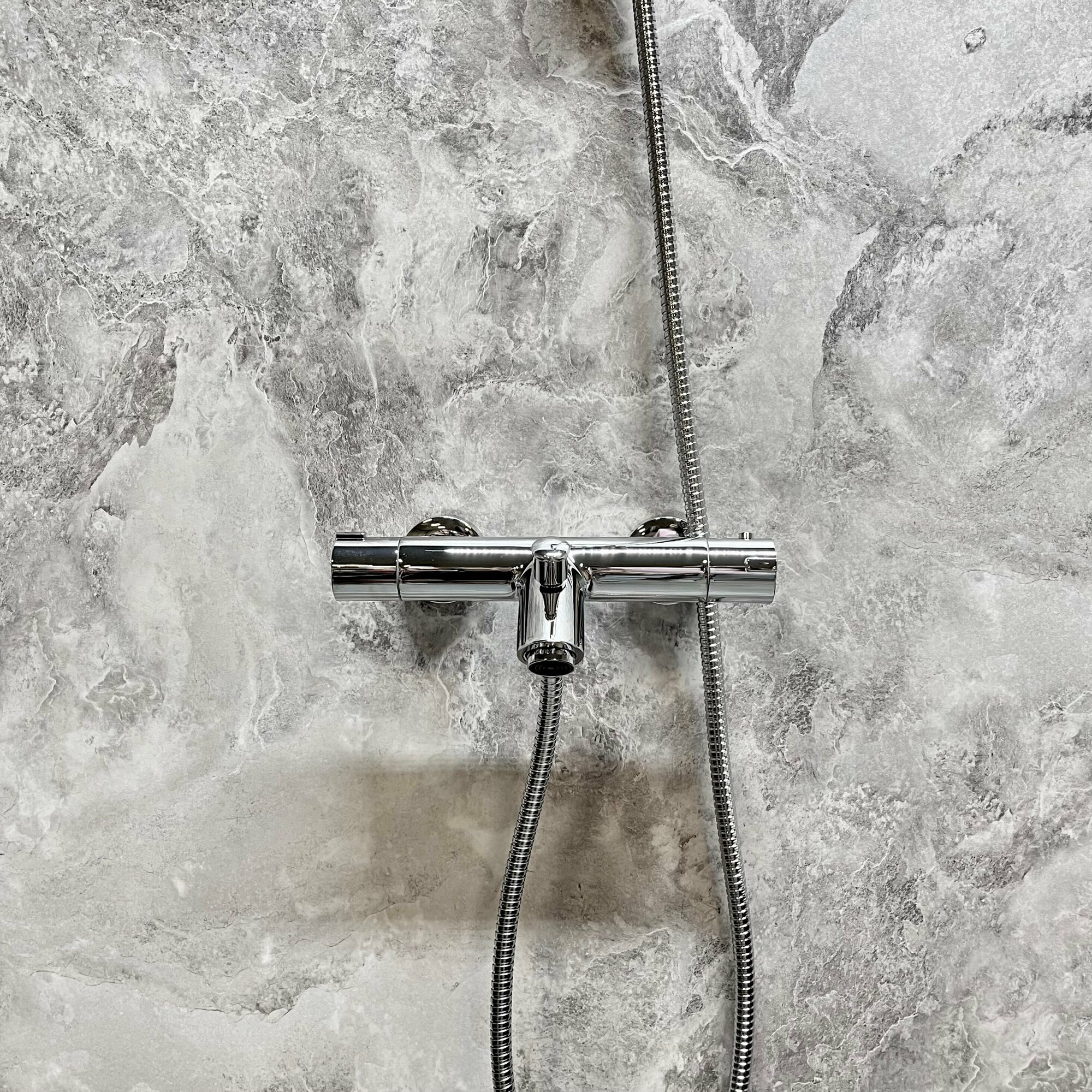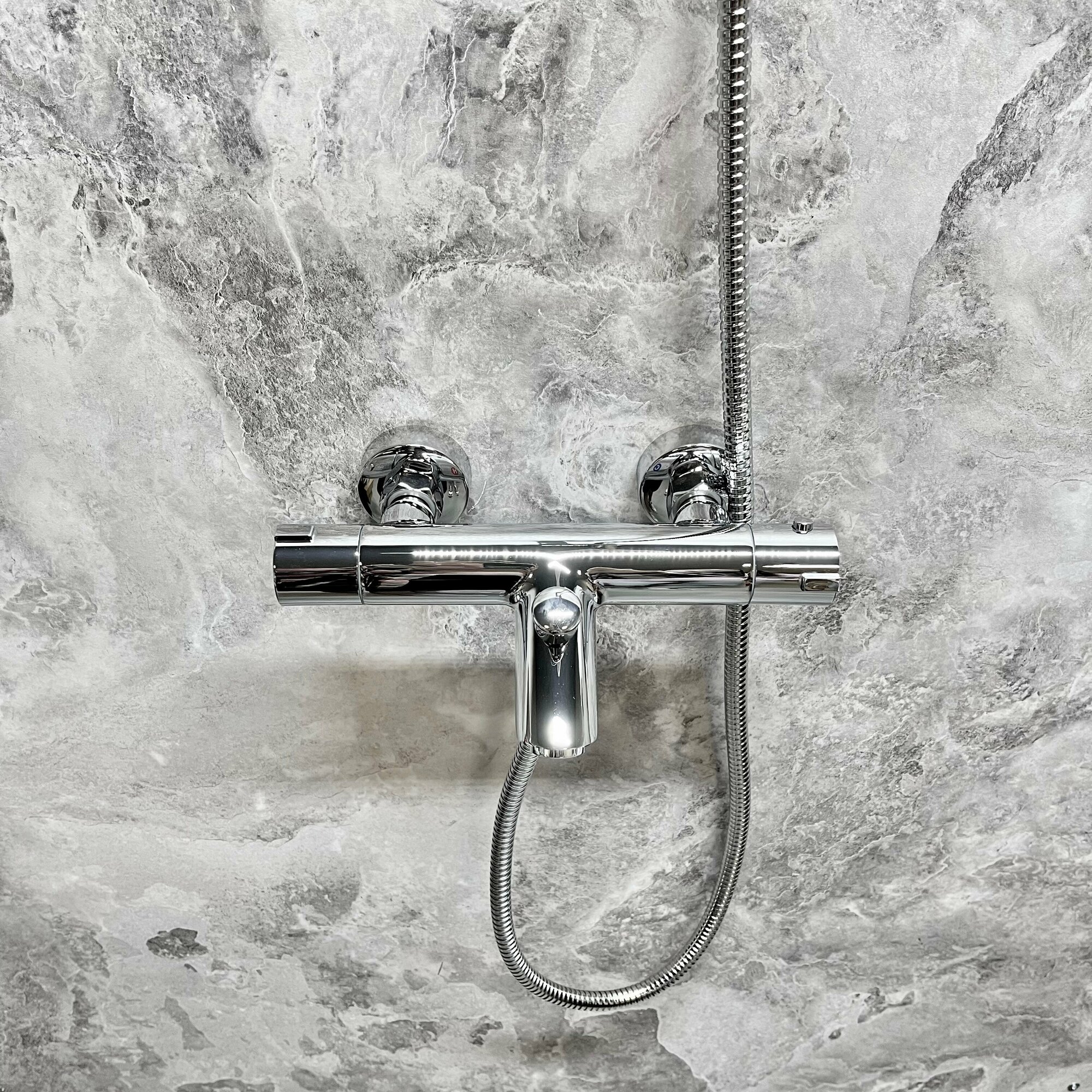 Смеситель для ванны короткий излив в комплекте с душевой лейкой, с термостатом.Цвет: хром