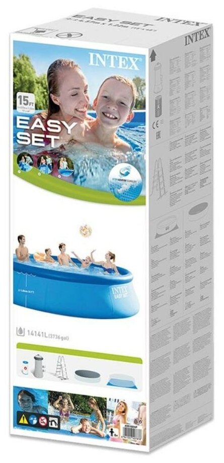 | Дополнительная информация | материал чаши бассейна: 3-х слойный ПВХ, армированный сеткой из полиэстера, комплектация: надувной бассейн Intex Easy Set, фильтр-насос картриджный 220В (3785 л/час), лестница, тент для бассейна, подстилка под бассейн, руководство по эксплуатации |
