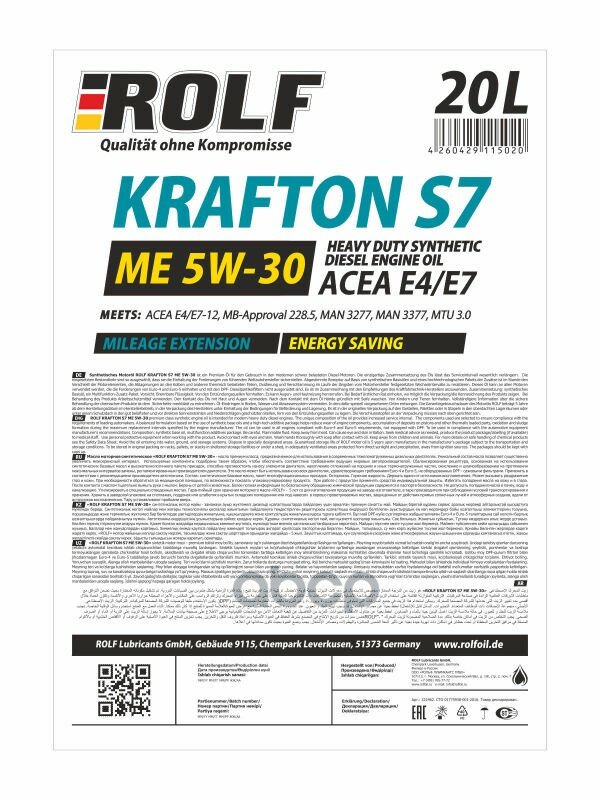 ROLF Масло Моторное Rolf Krafton S7 Me 5W30, 20 Л Krafton S7 Me 5W-30 Acea E4