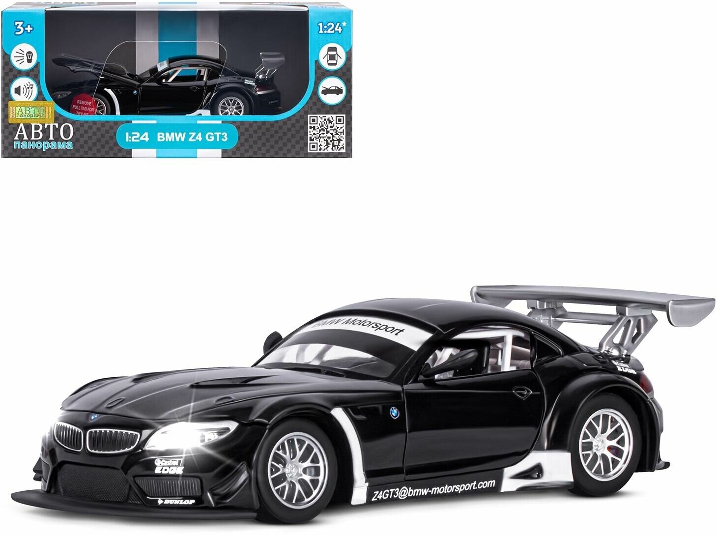 Модель машины Автопанорама 1:24, BMW Z4 GT3, черный, свободный ход колес, открываются двери, капот, свет, звук