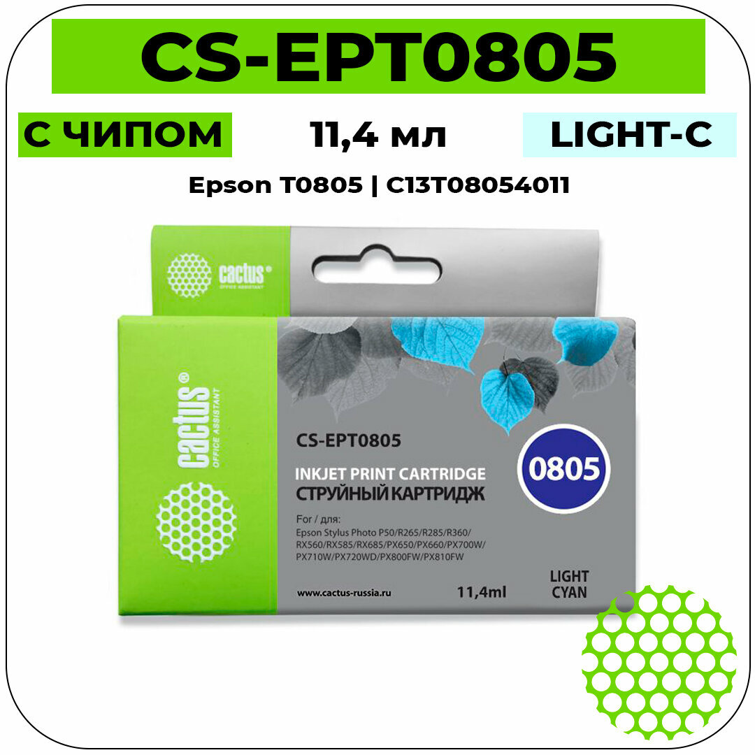 Картридж Cactus CS-EPT0805 T0805 светло-голубой, для EPSON Stylus Photo P50/PX650/PX660/PX700/PX700W/PX710/PX710W/PX720/PX720WD/PX800/PX800FW/PX810/PX810FW/PX820/PX820FWD/R265/R285/R360/RX560/RX585/RX685