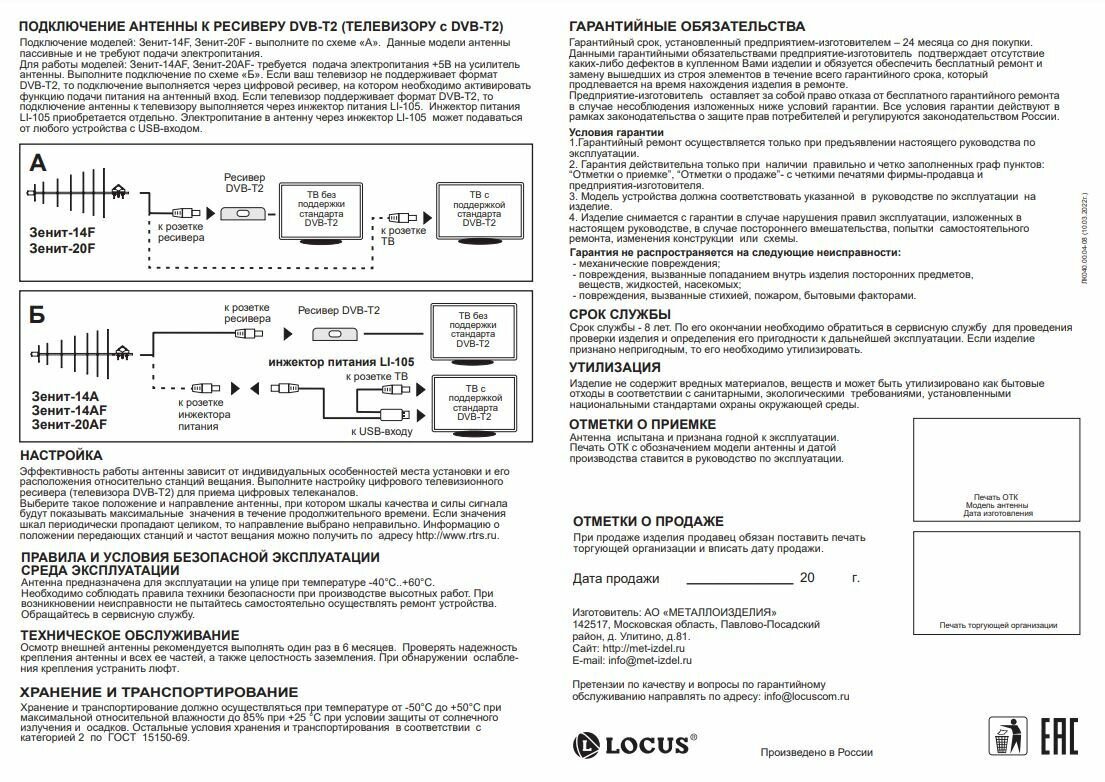 Локус Зeнит-14AF(L011.14D), Антенна телевизионная, активная, DVB-T/DVB-T2
