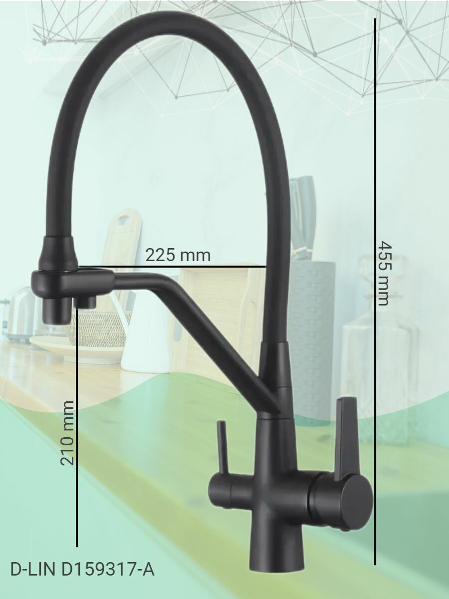 Смеситель для кухни D-Lin с подключением фильтра питьевой воды и гибким изливом, черный D159317-A