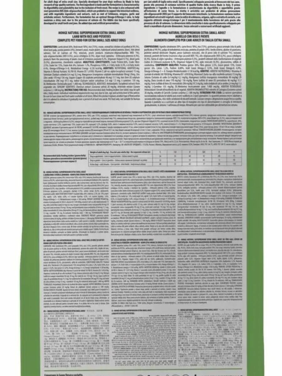 | Минусы: | Очень мелкие гранулы. Кормить можно только мелкашей. Средним и крупным породам собак гранулы не подходят. Нельзя говорить о корме как всепородном. Компании Монж стоит разработать линейку с кроликом и бататом или рисом для крупных и средних пород |