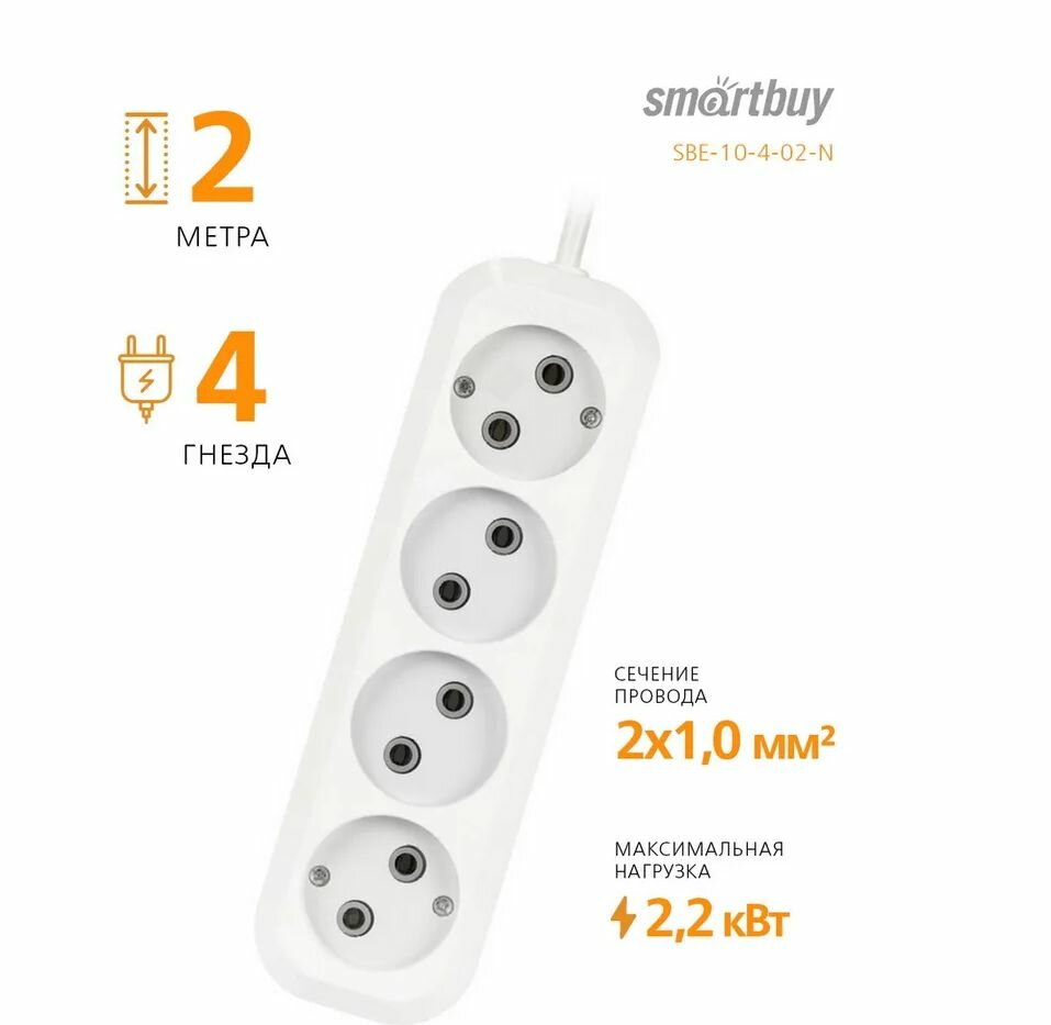 Smartbuy Sbe-10-4-02-n 4 гнезда 2 метра (10А/2.2кВт, ПВС 2х1.0)