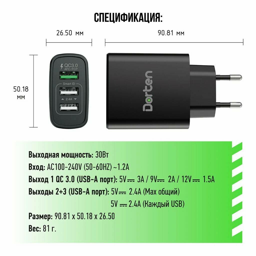 Сетевое зарядное устройство Dorten 3-Port USB 30 Вт блок питания с функцией быстрой зарядки Quick Charger 3.0 - Черный