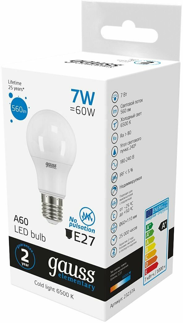Лампа светодиодная gauss 23237A, E27, A60, 7 Вт, 6500 К