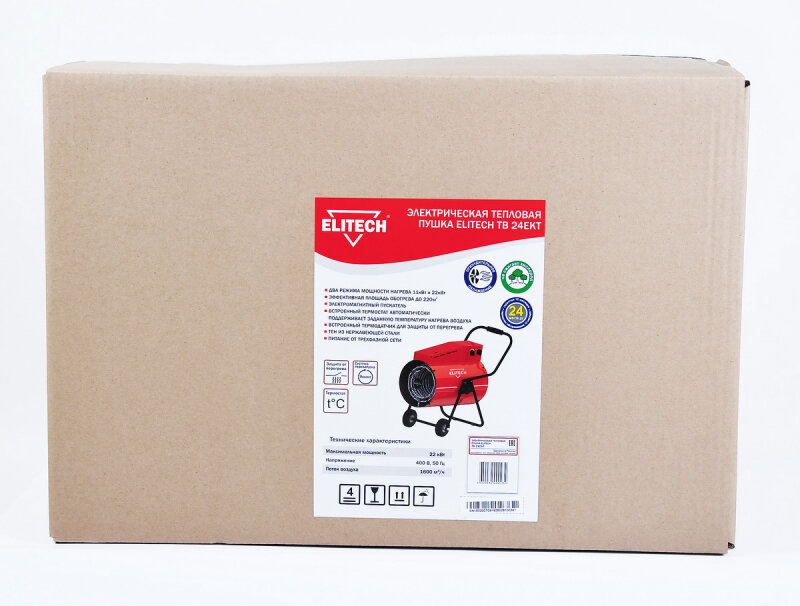 Ниже Вы можете прочитать отзывы на Тепловая электрическая пушка Elitech ТВ 24ЕКТ 380В,11000-22000Вт,поток-1600м3\ч,термостат,силовой разъем, ознакомится с подробными характеристиками, посмотреть интересные обзоры и фотографии на Тепловая электрическая пушка Elitech ТВ 24ЕКТ 380В,11000-22000Вт,поток-1600м3\ч,термостат,силовой разъем.