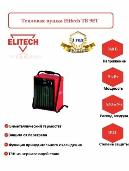Ниже Вы можете прочитать отзывы на Тепловая электрическая пушка ELITECH ТВ 9ЕТ 380В,6000-9000Вт,поток-850м3\ч,термостат,силовая вилка+розетка, ознакомится с подробными характеристиками, посмотреть интересные обзоры и фотографии на Тепловая электрическая пушка ELITECH ТВ 9ЕТ 380В,6000-9000Вт,поток-850м3\ч,термостат,силовая вилка+розетка.