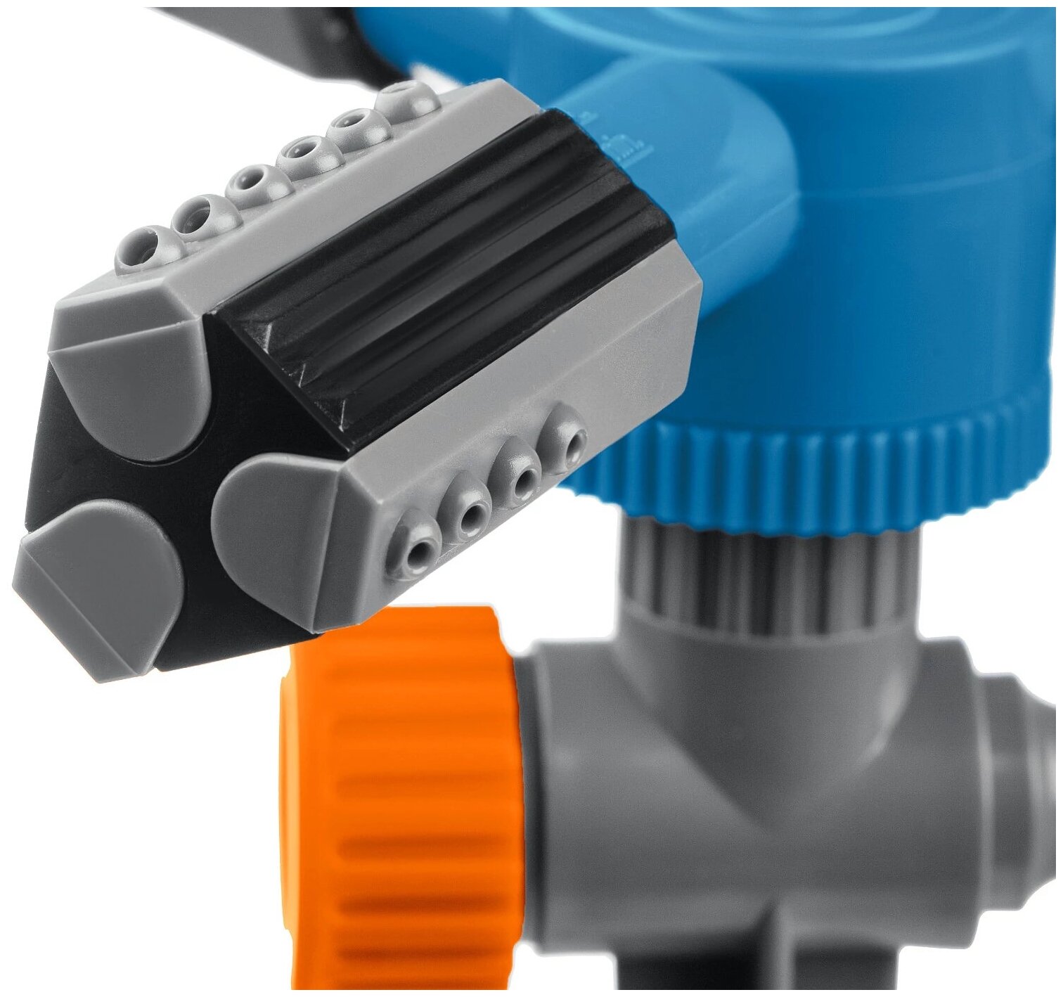 | Дополнительная информация | площадь полива регулируется поворотом насадок на каждой из лопастей, которые имеют 3 конфигурации, отличающиеся разным количеством дюз: 4, 5 либо 6 штук; распылитель снабжен двумя соединительными гнездами, что позволяет использовать его в цепочке из нескольких распылителей |