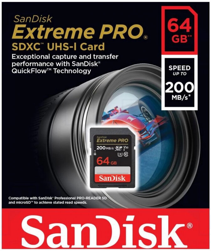 Карта памяти SanDisk SDXC Extreme Pro Class 10 UHS-I V30 U3 (200/90MB/s) 64GB