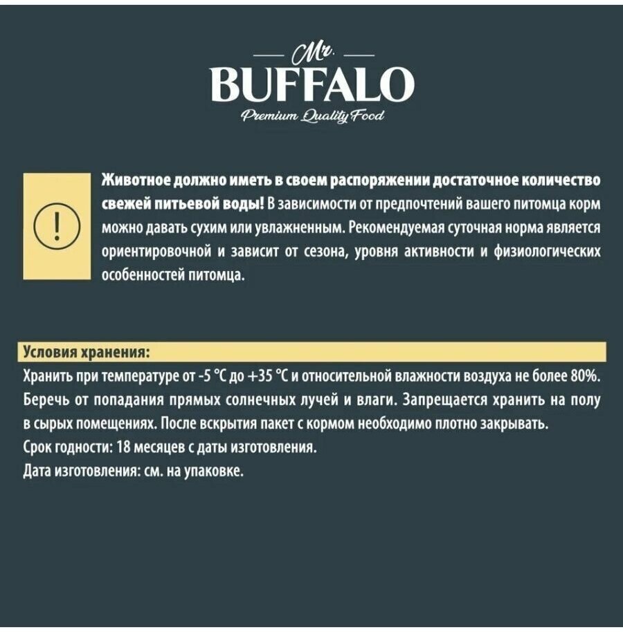 | Дополнительная информация | беречь от попадания прямых солнечных лучей и влаги; запрещается хранить на полу в сырых помещениях; после вскрытия пакет с кормом необходимо плотно закрывать |