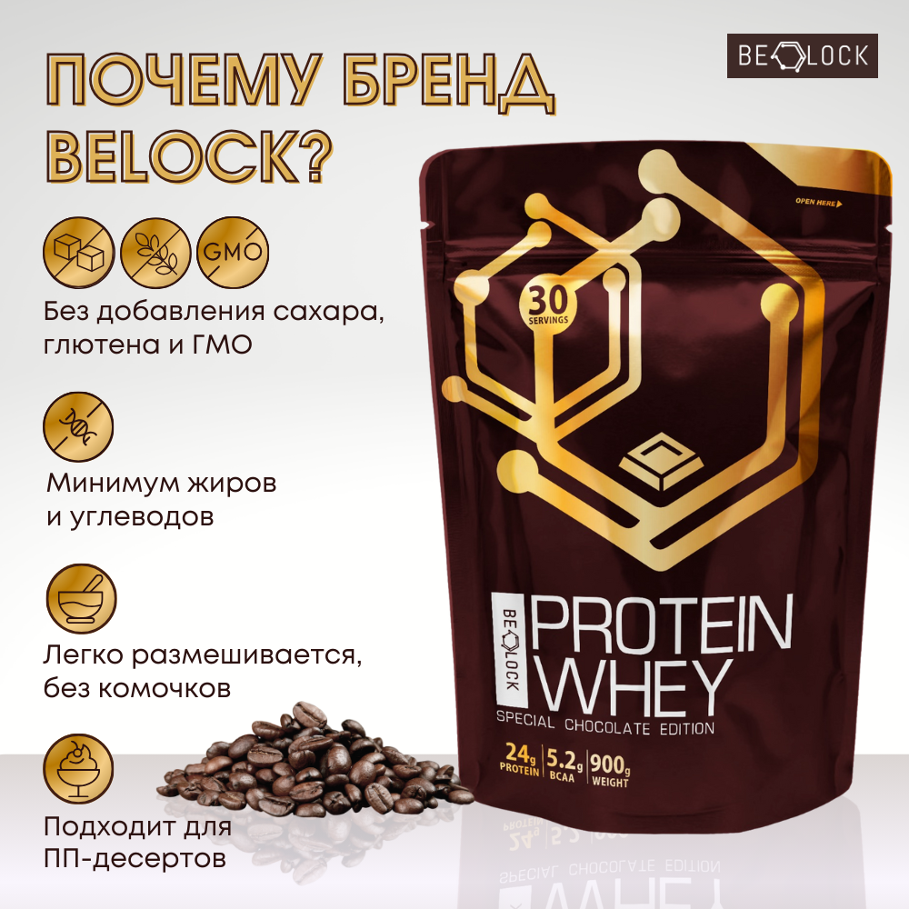 Протеин сывороточный BELOCK, whey protein, протеиновый коктейль без сахара, шоколад, 900 гр, 30 порций