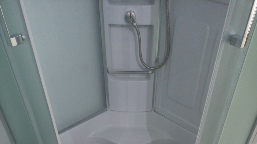 | Плюсы: | Двери раздвижные на металлических роликах, вода сквозь них не проникает. |
