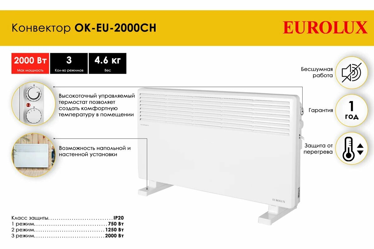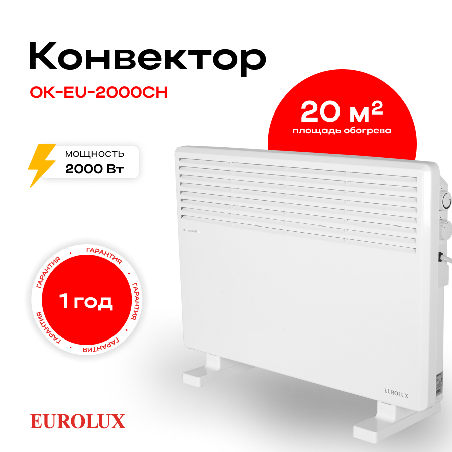 Конвектор, обогреватель электрический Eurolux ОК-EU-2000 (2 режима; 25м2; термостат)