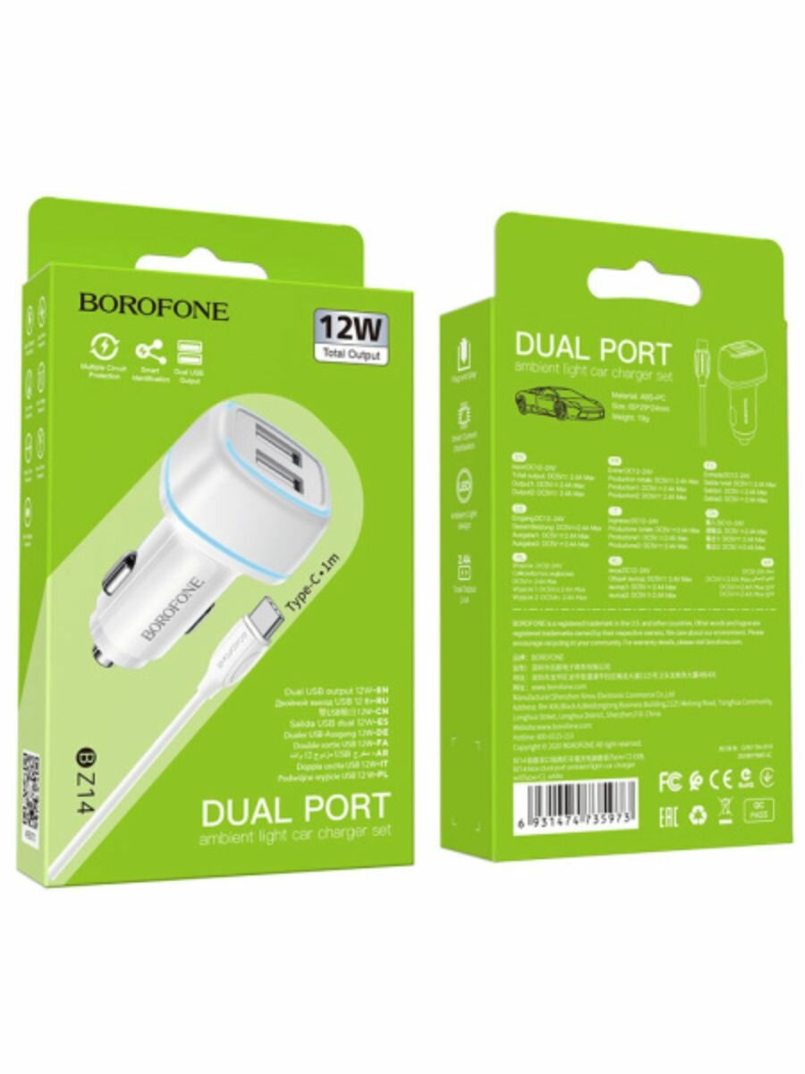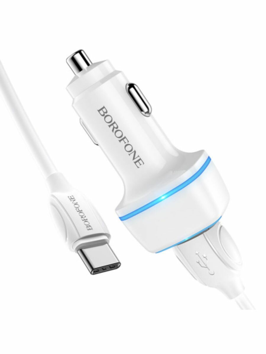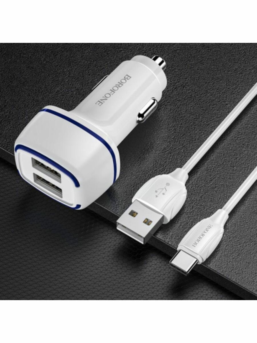 Автомобильное зарядное устройство BOROFONE BZ14 Max, 2xUSB с Кабелем USB - Type-C, 2.4A, белый