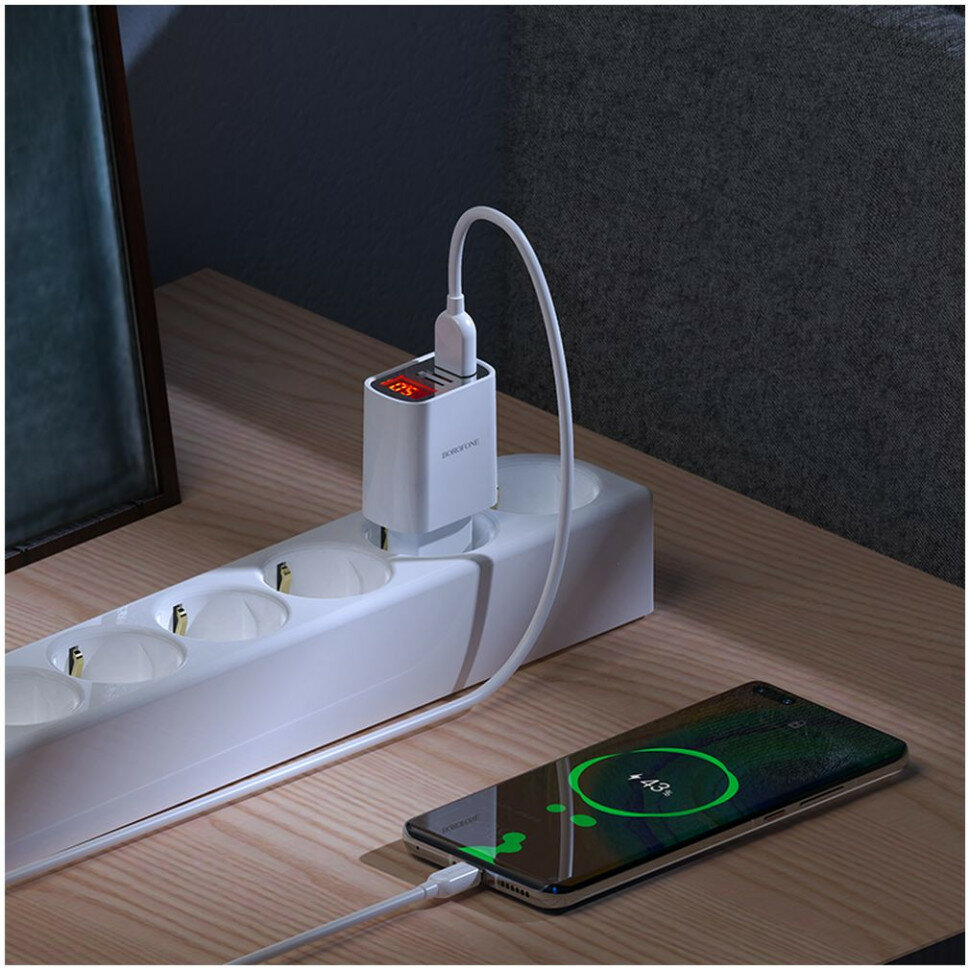 Borofone Сзу ba58a mighty 2xusb, 2.4а, led дисплей + кабель usb type-c, 1м (белый) 0L-00051172 23752-BA58AWT