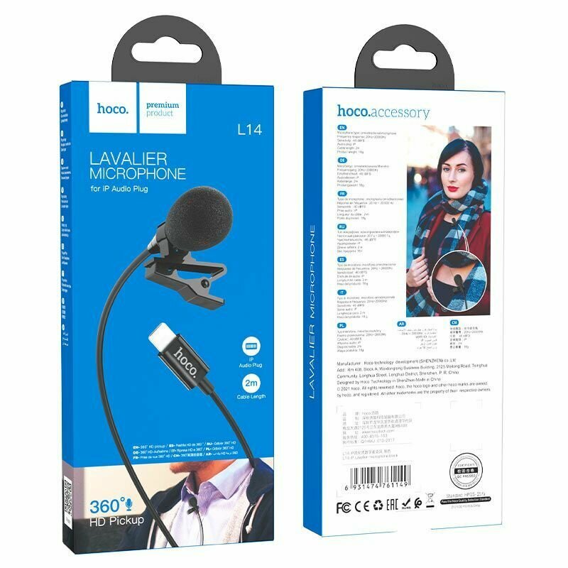Микрофон петличный HOCO, L14, Lavalier, пластик, кабель 8 pin, цвет: чёрный