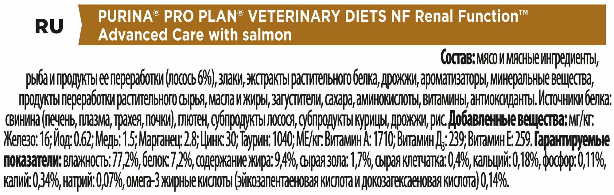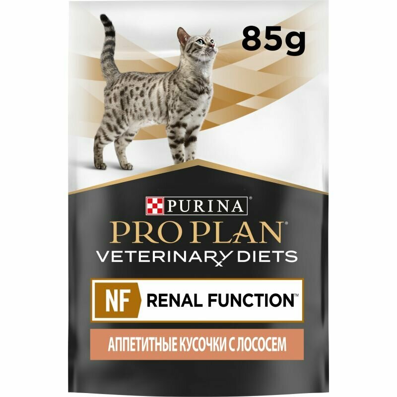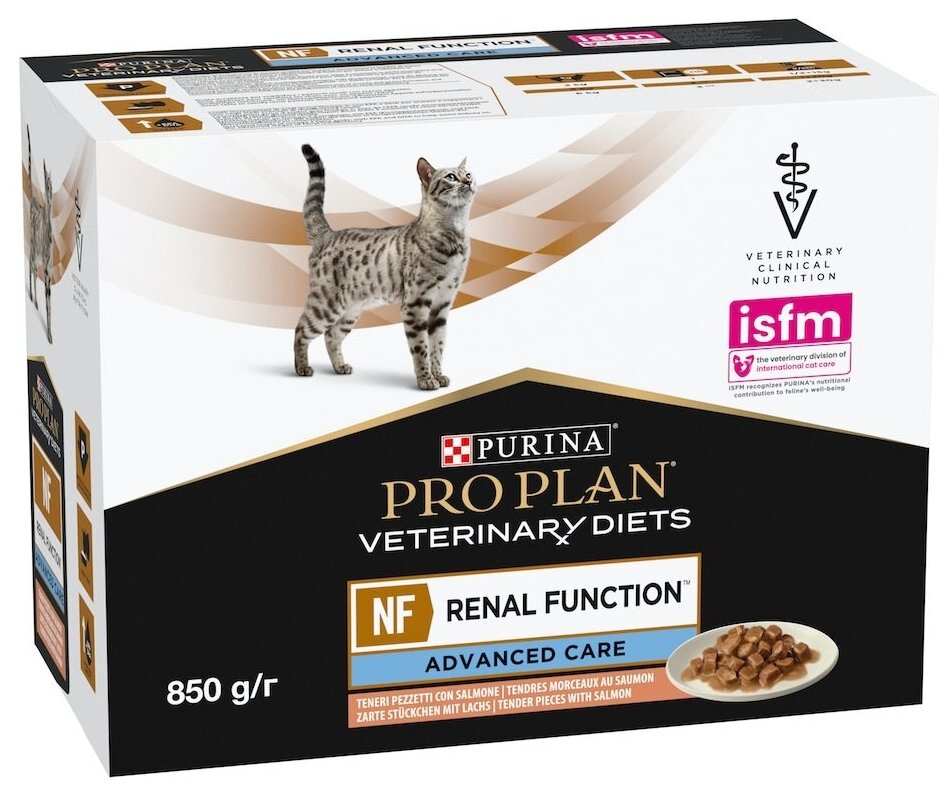 | Дополнительная информация | Влажный корм для кошек Purina Pro Plan Veterinary Diets NF Renal Function Advanced Care, для поддержания функции почек на поздней стадии хронической почечной недостаточности с лососем, в паучах - 85 г - 10 штук |