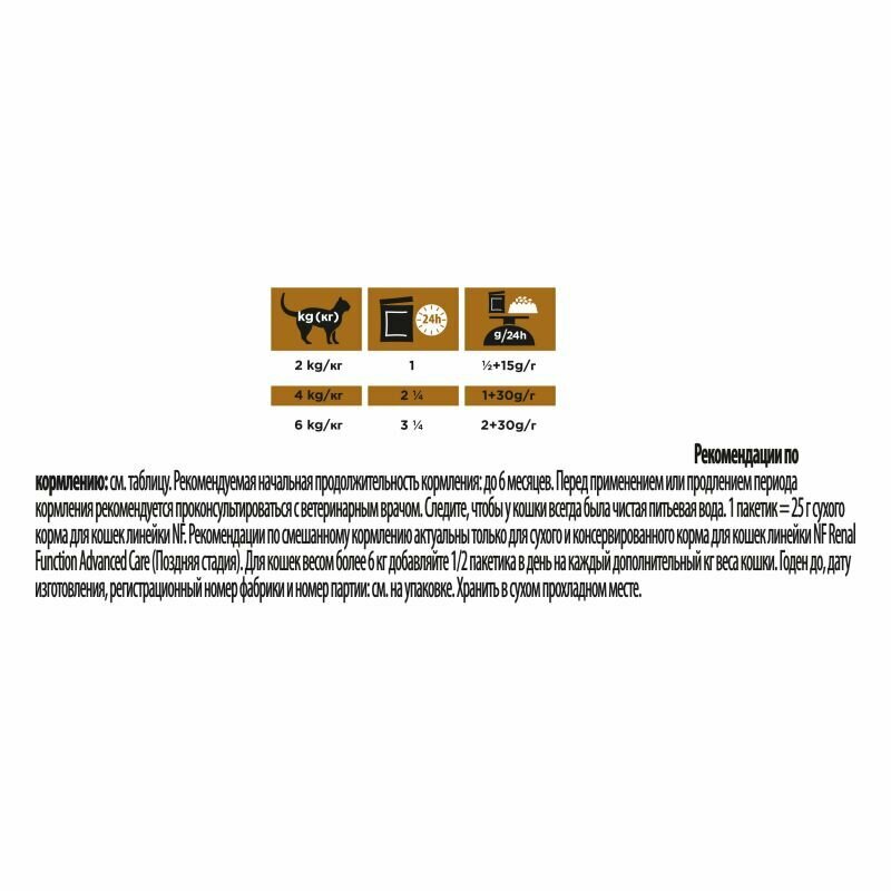 | Дозировка | Рекомендуемая начальная продолжительность кормления: до 6 месяцев. Перед применением или продлением периода кормления рекомендуется проконсультироваться с ветеринарным врачом. Следите, чтобы у кошки всегда была чистая питьевая вода. 1 пакетик = 25 г сухого корма для кошек линейки NF. Рекомендации по смешанному кормлению актуальны только для сухого и консервированного корма для кошек линейки NF Renal Function Advanced Care (Поздняя стадия). Для кошек весом более 6 кг добавляйте 1/2 пакетика в день на каждый дополнительный кг веса кошки. |