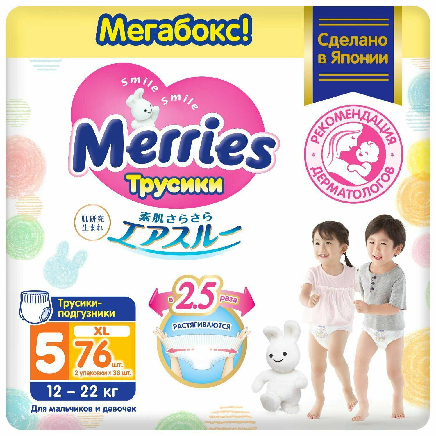 Подгузники-трусики для детей MERRIES размер XL 12-22 кг, 76 шт