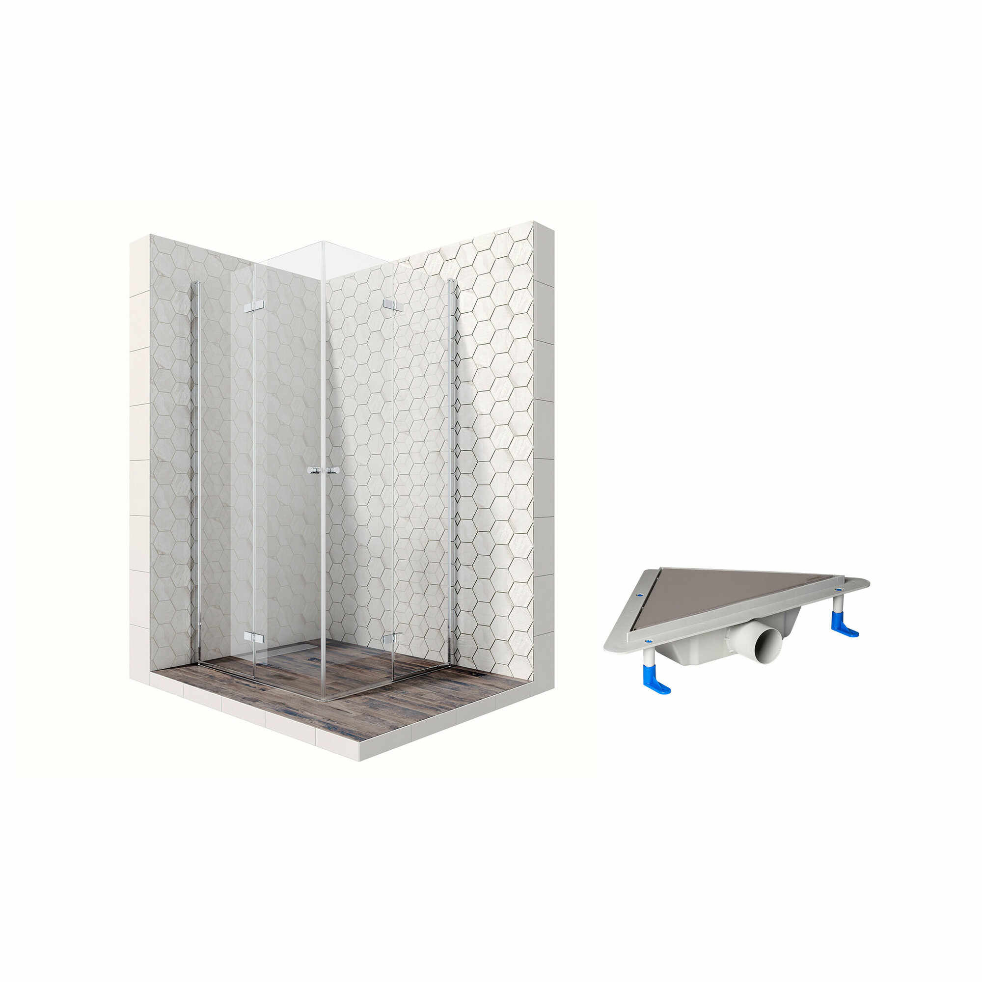 Душевой уголок 90х90 с трапом и распашными складными дверями Ambassador Nord 13011108-ST15: душевое ограждение из стекла 6 мм, профиль хром