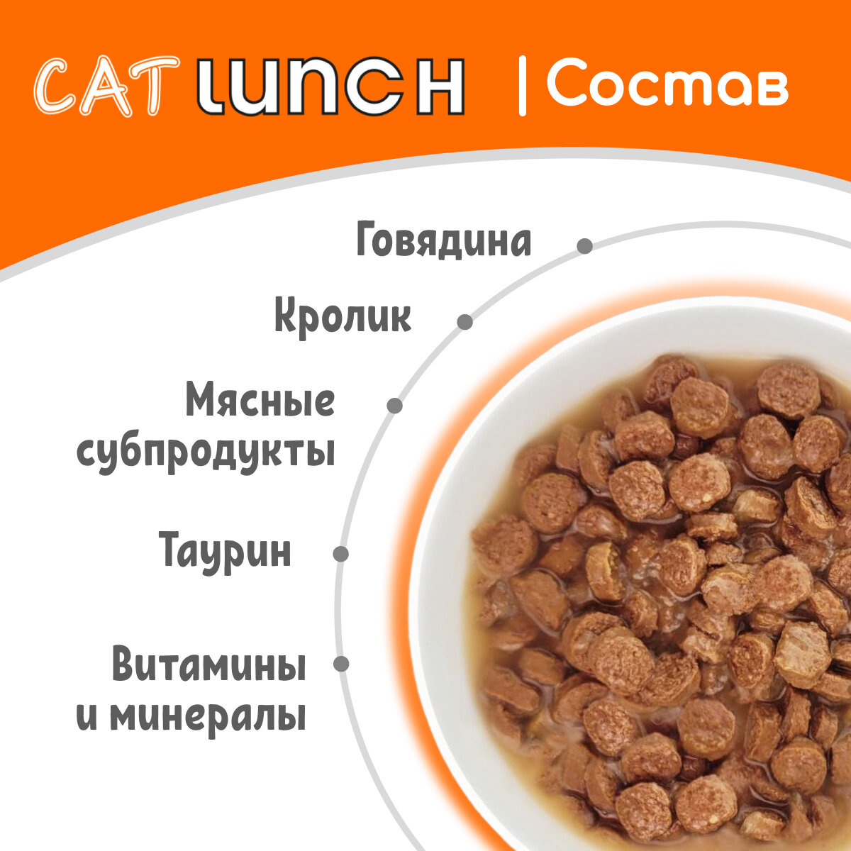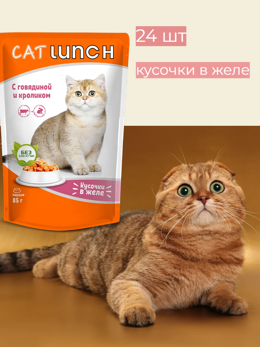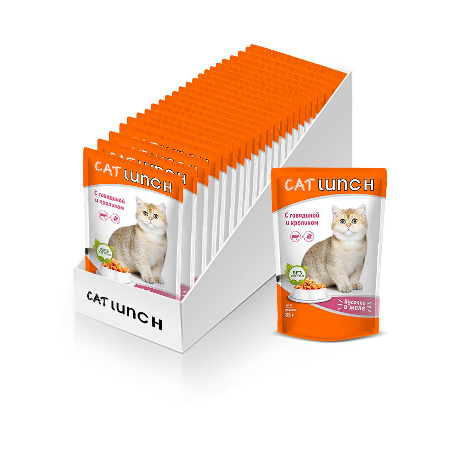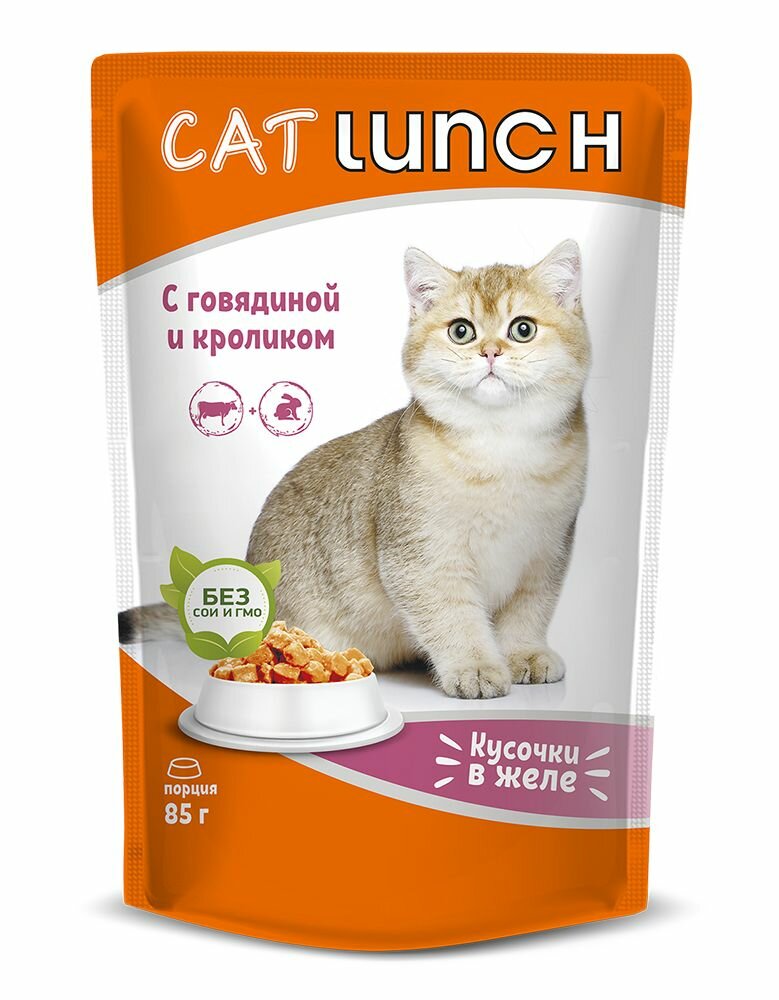Влажный корм для кошек Cat Lunch кусочки в желе Говядина и Кролик, паучи по 85г (24 шт. в упаковке)