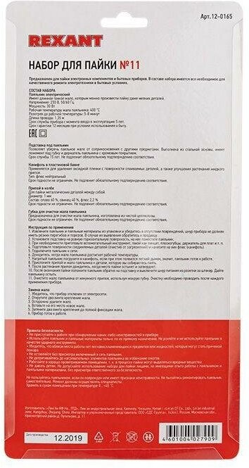 Набор для пайки №11 (паяльник 30Вт подставка губка для удаления припоя канифоль припой) Rexant 12-0165 ( 1упак. )