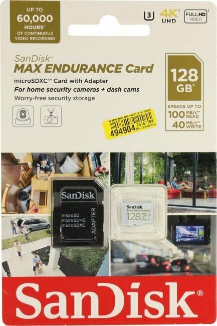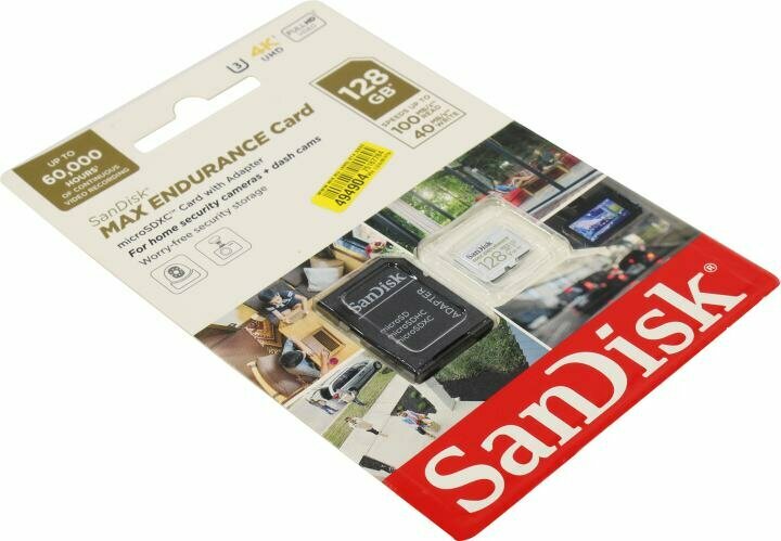 Карта памяти SanDisk MAX ENDURANCE microSDXC 128GB + SD Adapter - for home security cameras & dashcams, up to 60,000 Hours, Full HD / 4K videos,