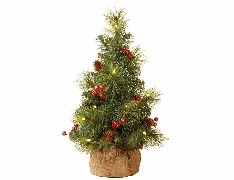 Ель настольная эвридей с шишками и ягодами, в мешочке, 60 см, 35 тёплых белых LED-огней, (хвоя леска+PVC), батарейки, National Tree Company