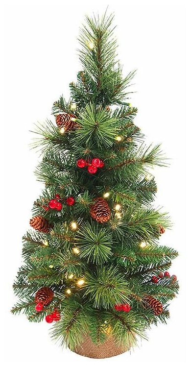 Ель настольная "Эвридей" с шишками и ягодами, в мешочке, 81 см, 50 тёплых белых LED-огней, (хвоя леска+PVC), батарейки, National Tree Company