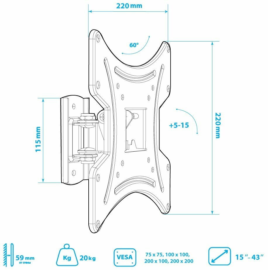 Кронштейн Tuarex ALTA-202 black, настенный для TV 15-43, поворот 60, наклон +5-15, от стены 59мм, макс 20кг, VESA 200x200 интересное: