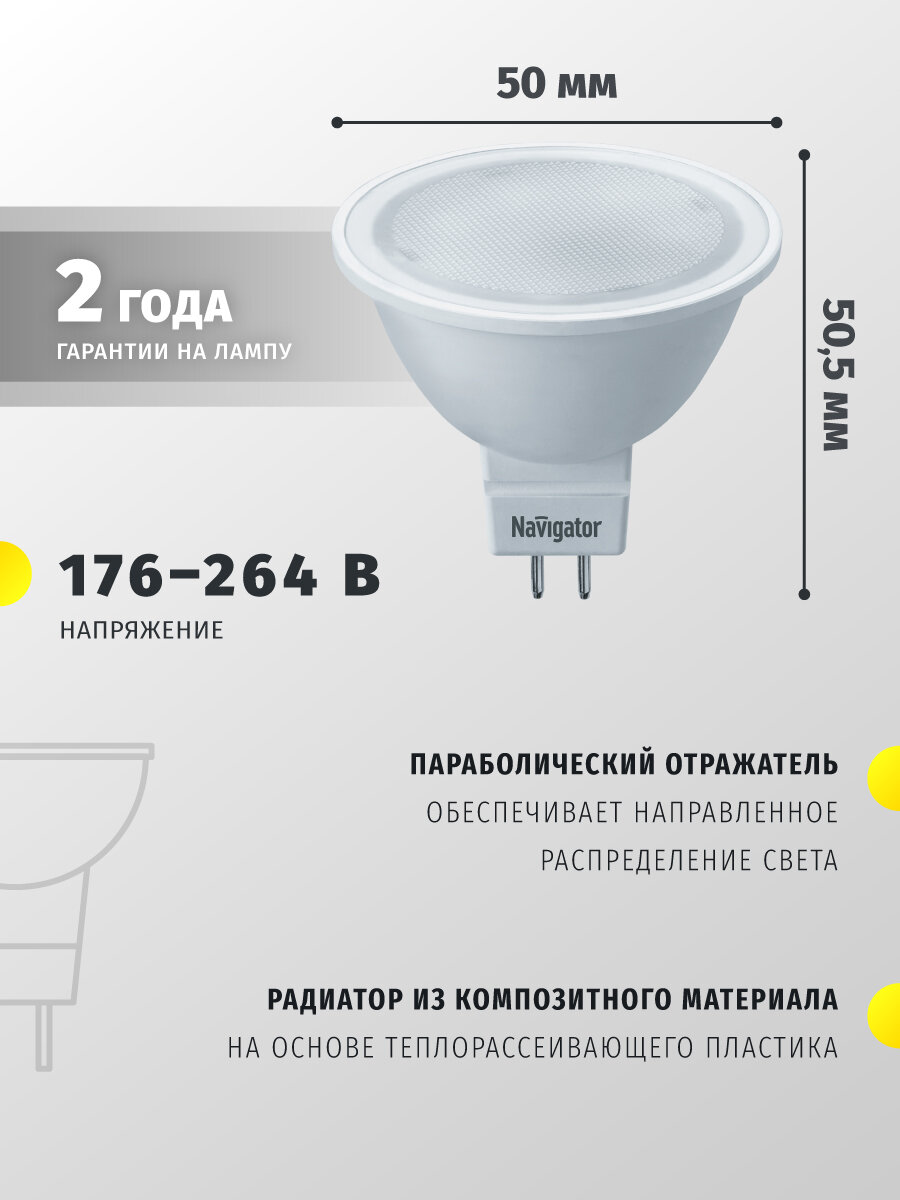 (5 шт.) Светодиодная лампочка Navigator MR16, мощность 7 Вт, напряжение питания 220 В, цветовая температура 3000 K, теплый белый свет, цоколь GU5.3, размер Ø50х52 мм