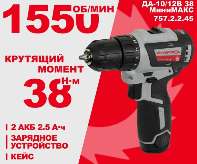 Дрель-шуруповерт Интерскол ДА-10/12В 38, 2.5Ач, с двумя аккумуляторами [757.2.2.45]