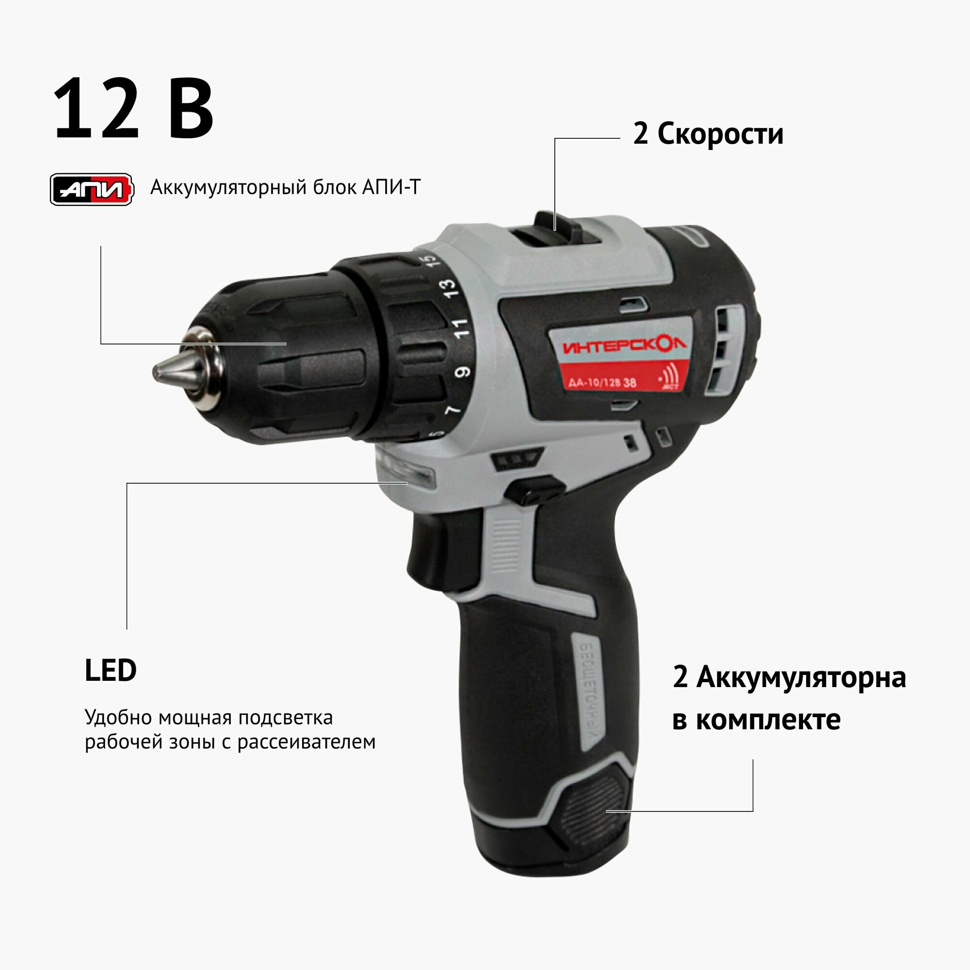 Бесщеточная аккумуляторная дрель-шуруповерт ИНТЕРСКОЛ ДА-10/12В 38 минимакс (757.2.2.45)