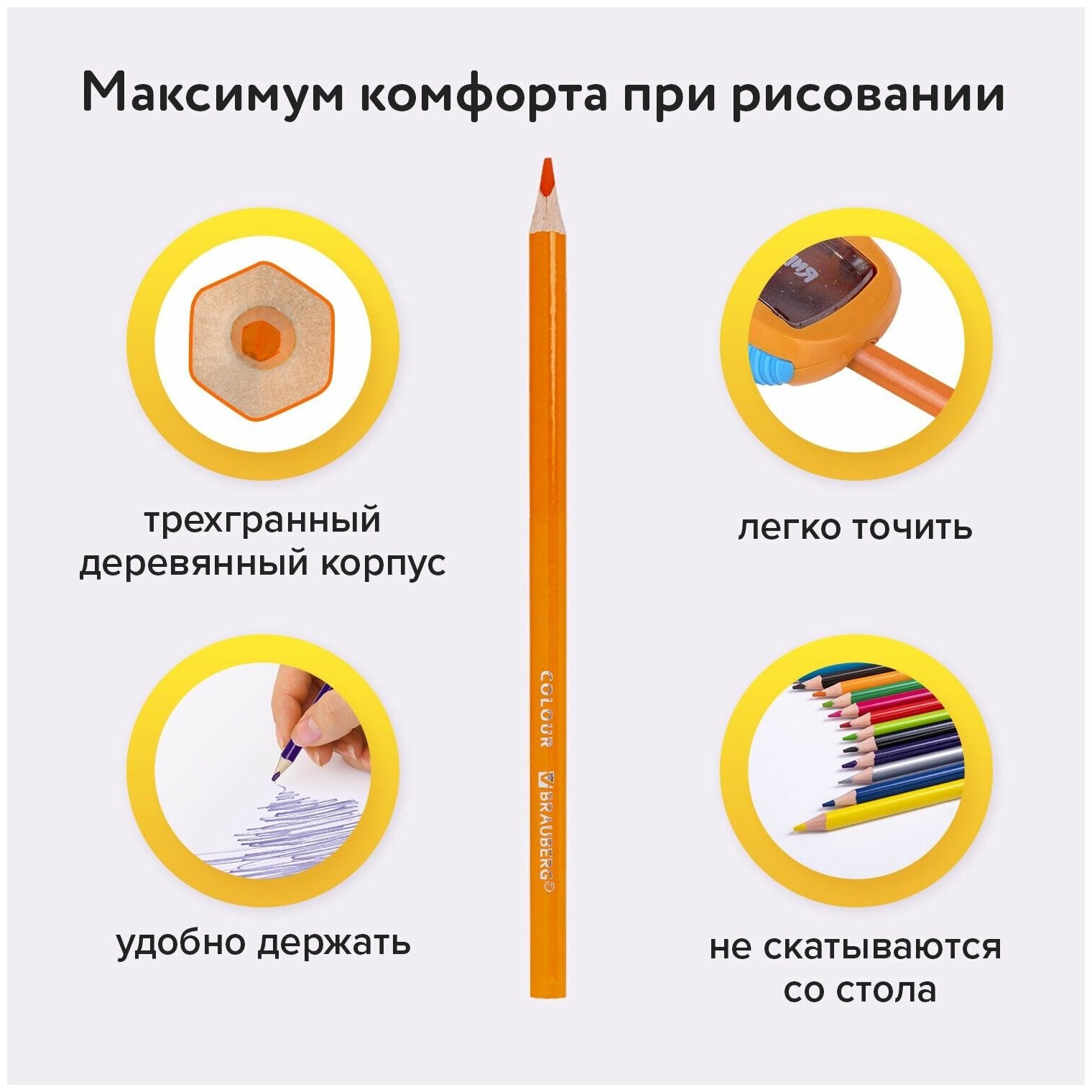 Карандаши деревянные цветные для рисования Brauberg Premium, 24 цвета, шестигранные, грифель мягкий 3,3 мм, натуральное дерево, 181658