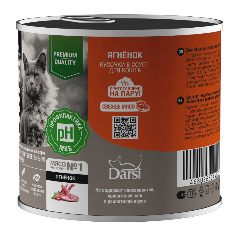 Влажный консервированный корм Darsi для кошек с чувствительным пищеварением "Кусочки с Ягненком" в соусе, 250 гр