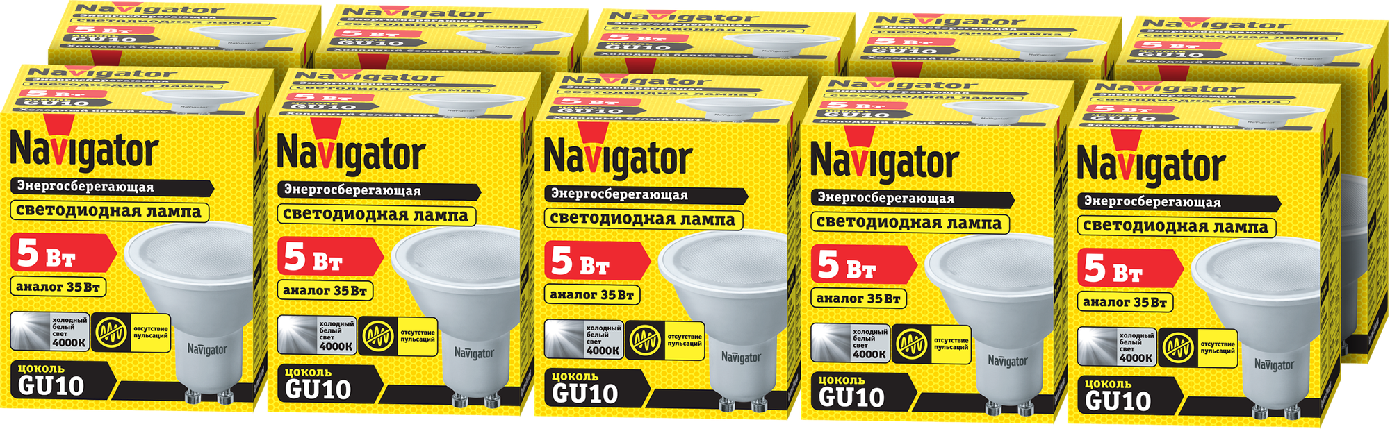 Купить Лампа светодиодная Navigator 94 130, 5 Вт, цоколь GU10, дневной свет 4000К, упаковка 10 шт.