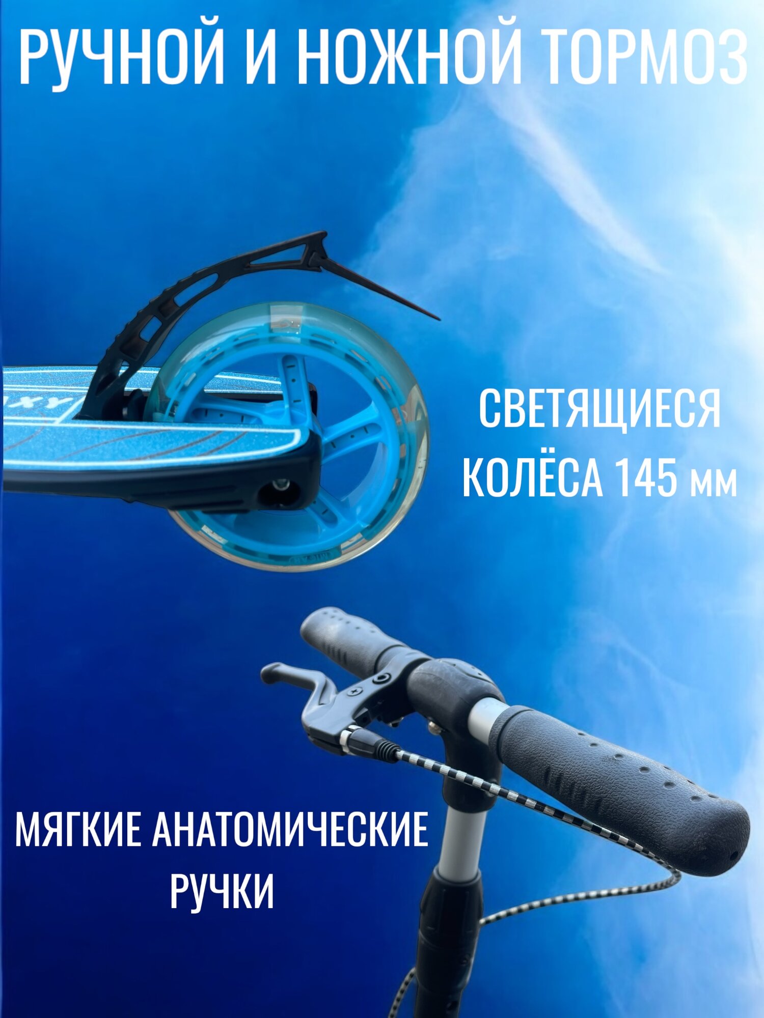 Самокат Micar Galaxy 145 Черно-голубой с ручным тормозом и светящимися колёсами интересное: