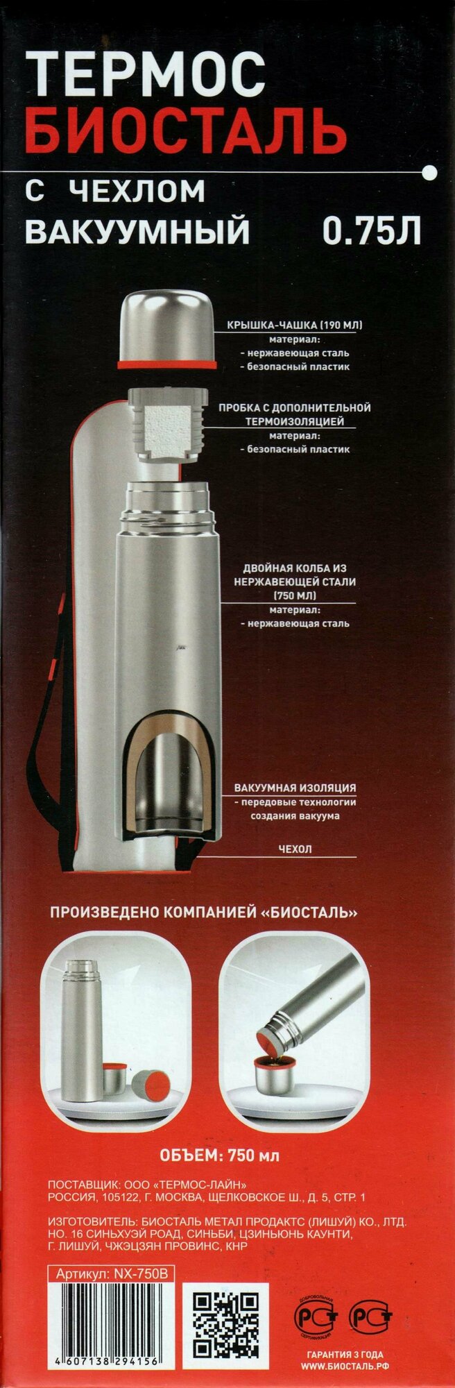Термос Биосталь Biostal для чая и кофе в чехле, 0.75 л., стальной, NX-750B