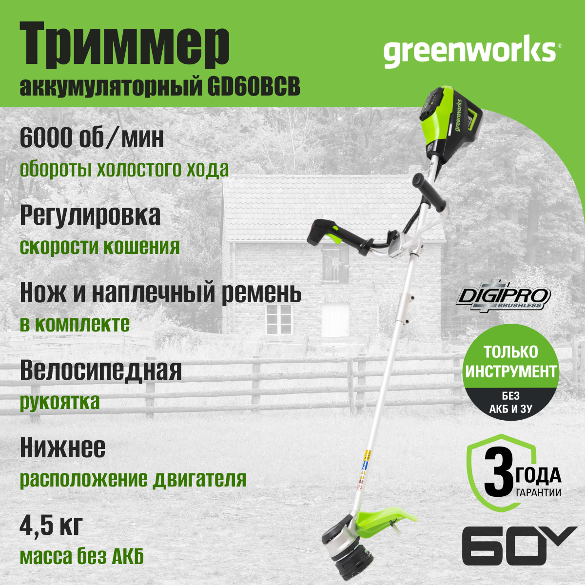 Триммер аккумуляторный Greenworks GD60BCB, без АКБ и ЗУ (2108407)
