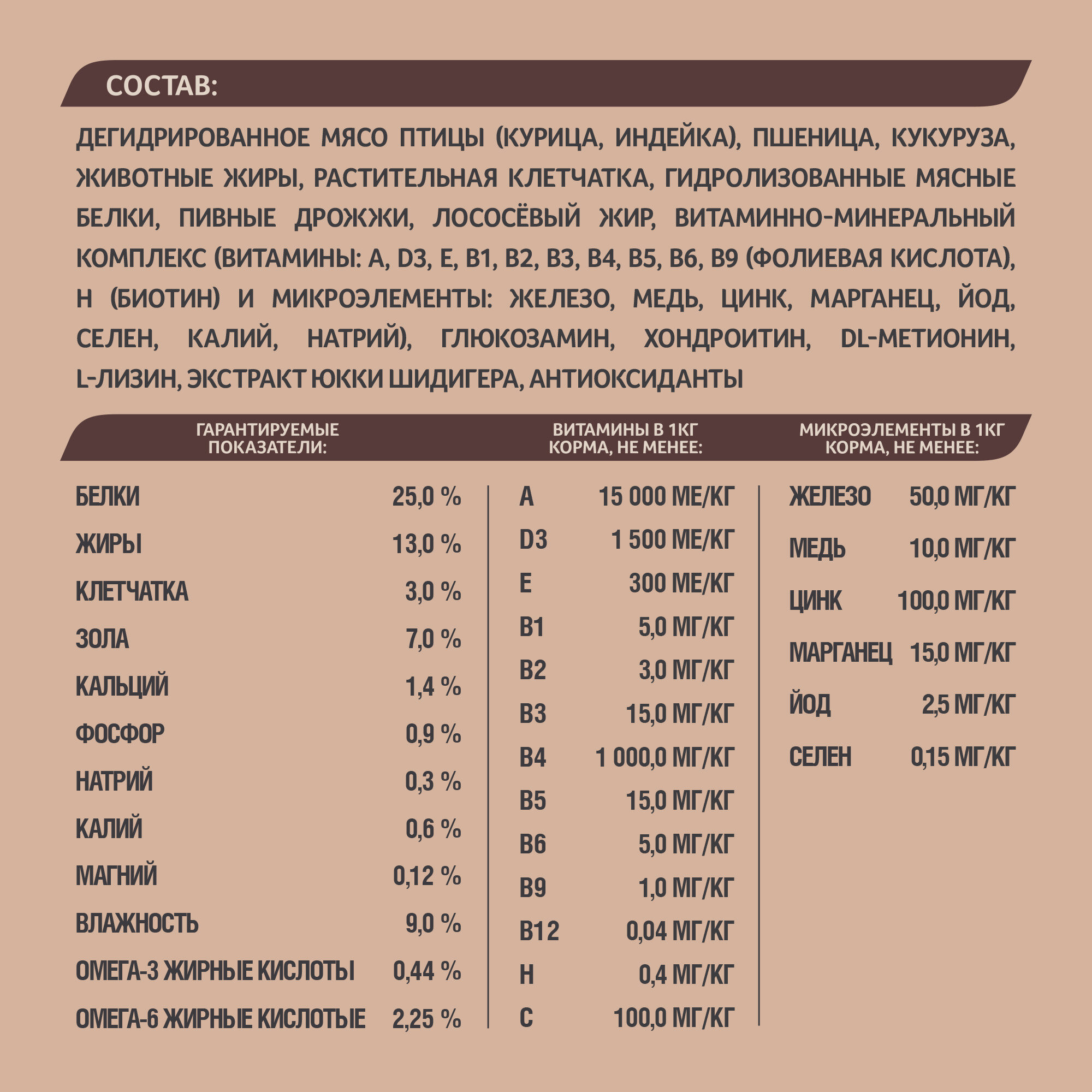 | Состав | дегидрированное мясо индейки, пшеница, кукуруза, животные жиры, дегидрированное мясо птицы, растительная клетчатка, гидролизованные животные белки, пивные дрожжи, лососевый жир, витаминно-минеральный комплекс (витамины: А, D3, Е, В1, В2, В3, В4, В5, В6, В9 (фолиевая кислота), В12, Н (биотин) и микроэлементы: железо, медь, цинк, марганец, йод, селен, калий, магний, натрий), Глюкозамин, Хондроитин, DL-метионин, L-цистеин, L-лизин, экстракт Юкка Шидигера, антиоксиданты |