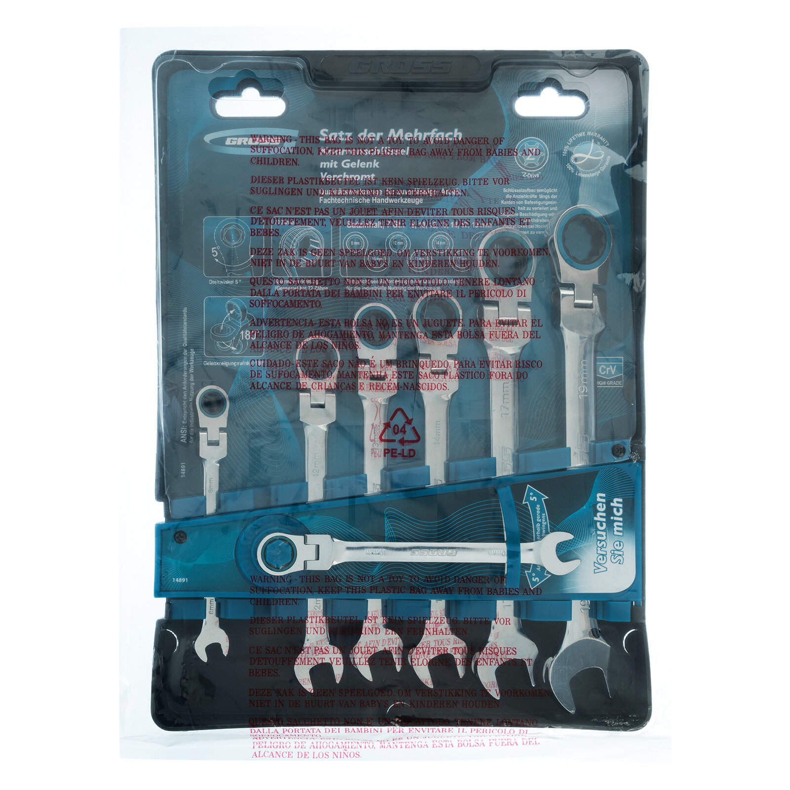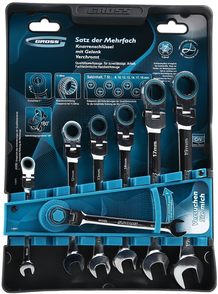 GROSS Набор ключей комбинированных с трещоткой, 8 - 19 мм, 7шт., шарнирные, CrV// 14891