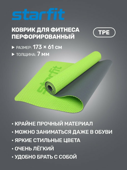 Коврик для йоги и фитнесаSTARFIT FM-202 TPE 173x61x0,7 см, перфорированный, ярко-зеленый интересное: