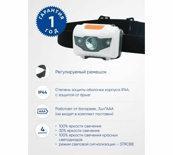 Фонарь налобный светодиодный, работающий от батареек 3*AAA, 1LED+2RED, IP44, пластик, TH2302
