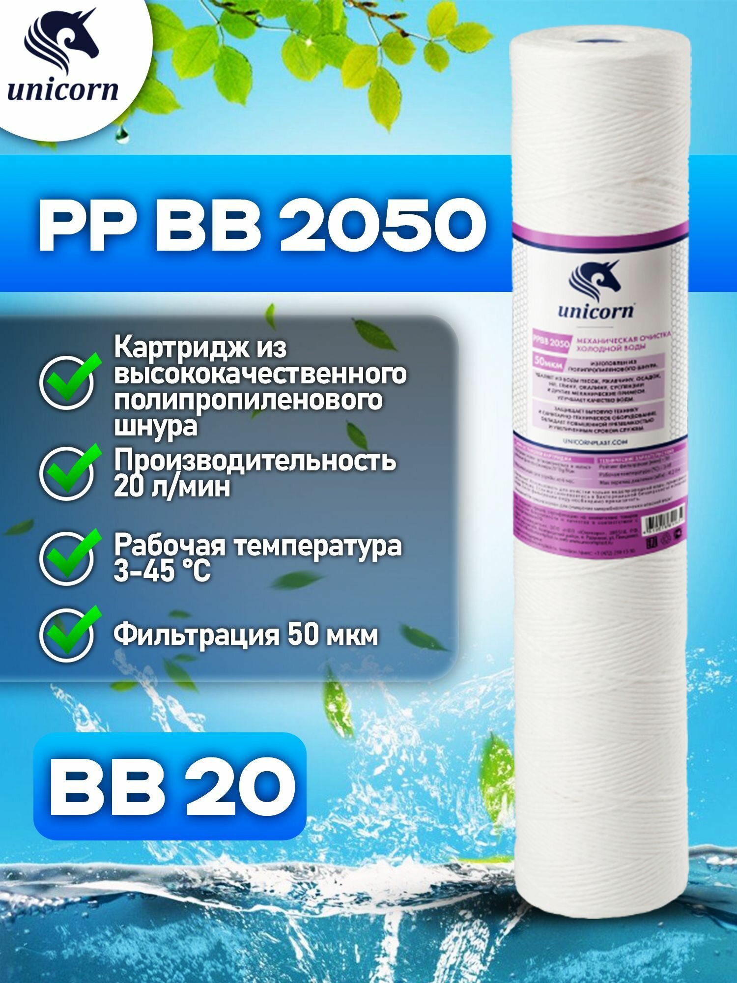 Механический картридж Unicorn из полипропиленового шнура, 20'' BB, 50 мкм, PP BB 2050 541191