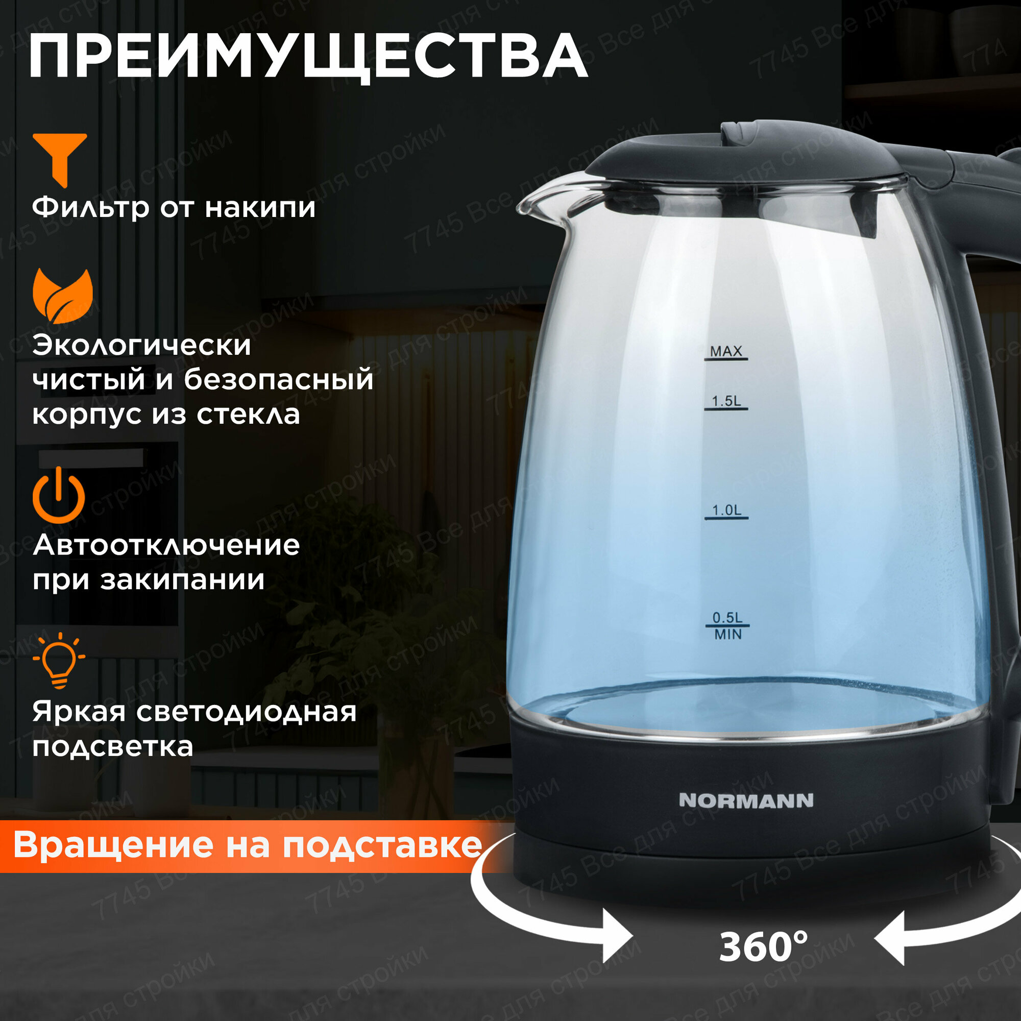СохранитьЧайник электрический стеклянный с подсветкой 1,7 л черный NORMANN AKL-236 интересное: