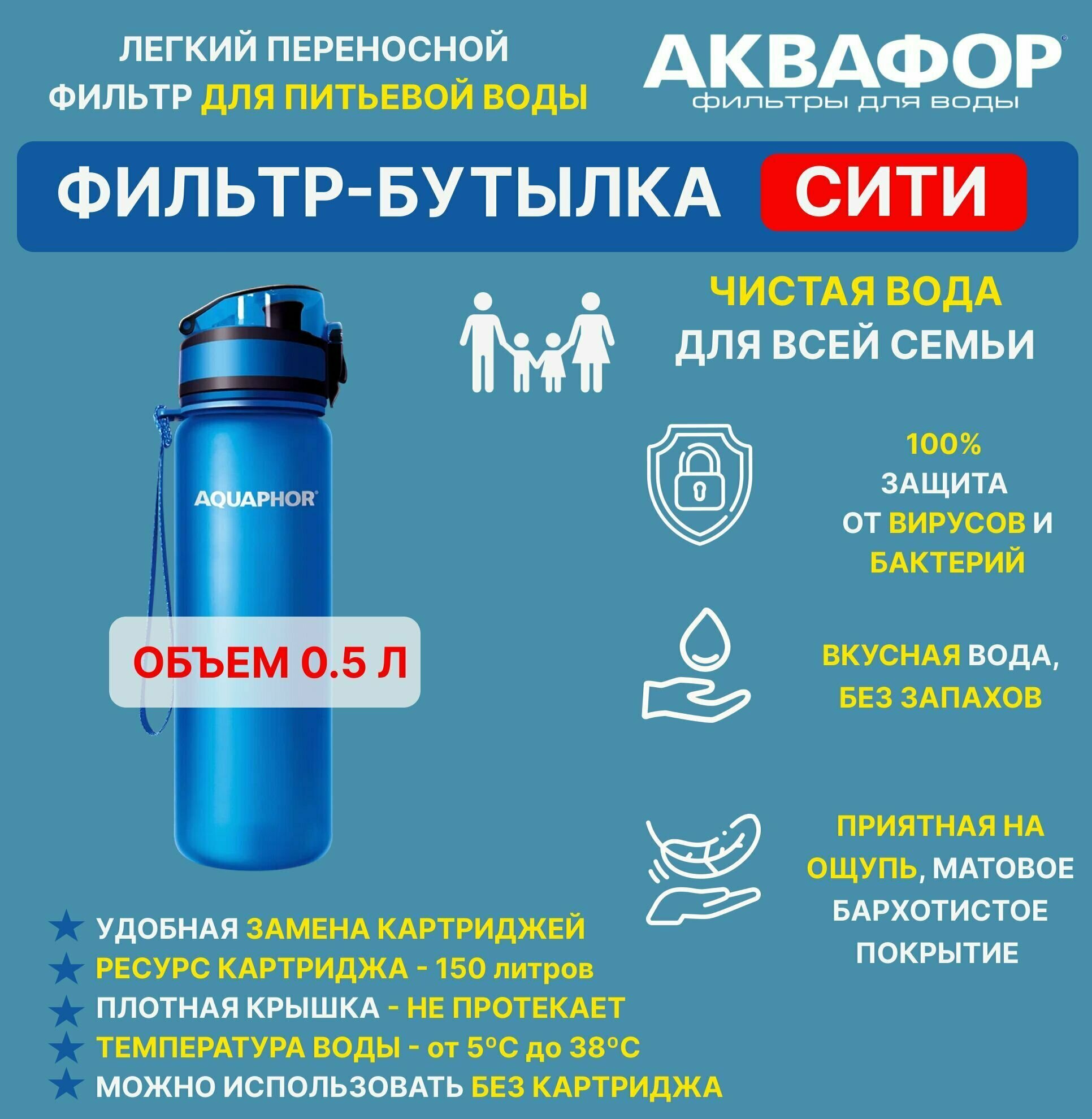 Фильтр-бутылка Аквафор Сити, 0.5л, синий