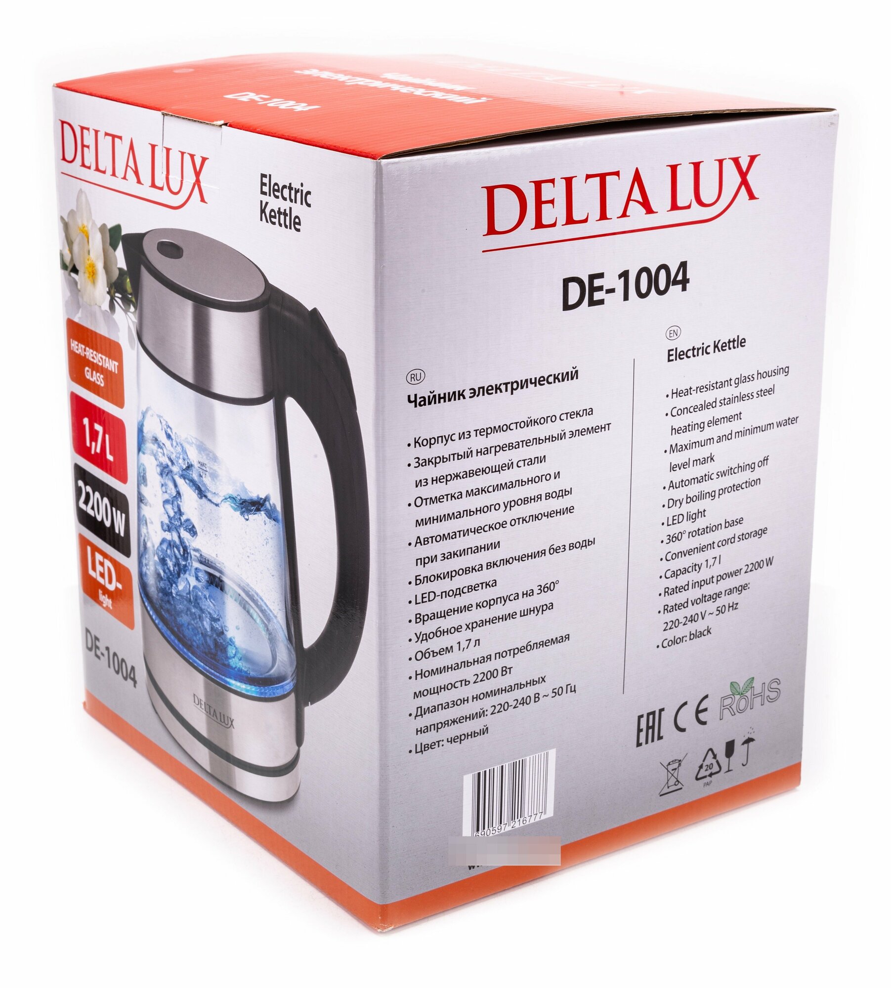 Чайник DELTA LUX DE-1004 корпус из жаропрочного стекла, черный нерж.: 2200Вт, 1,7л