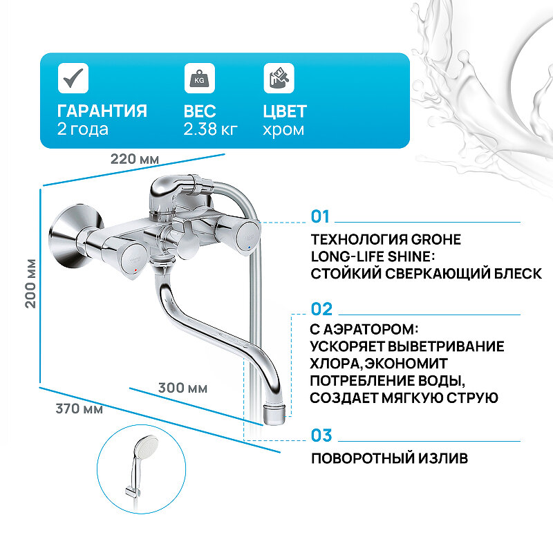| Комплектация | аэратор / душевая лейка / душевой шланг / крепления / настенный держатель |